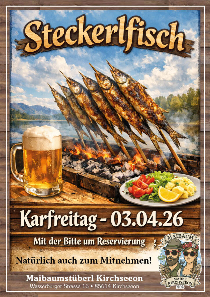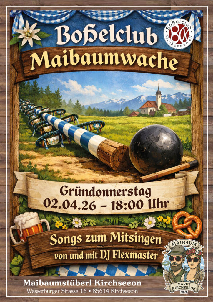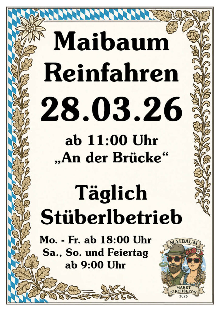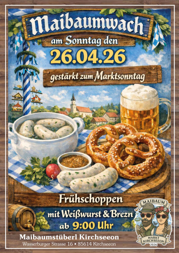 Die „Aktion Maibaum“ begrüßt Euch in unserem „griabigen“ Stüberl. Schauts auf eine Brotzeit, ein kühles Getränk und auf einen Ratsch vorbei. Wir freuen uns auf viele Besucher! Über Instagram informieren wir Euch über Aktionen und alle Informationen rund um den Kirchseeoner Maibaum.